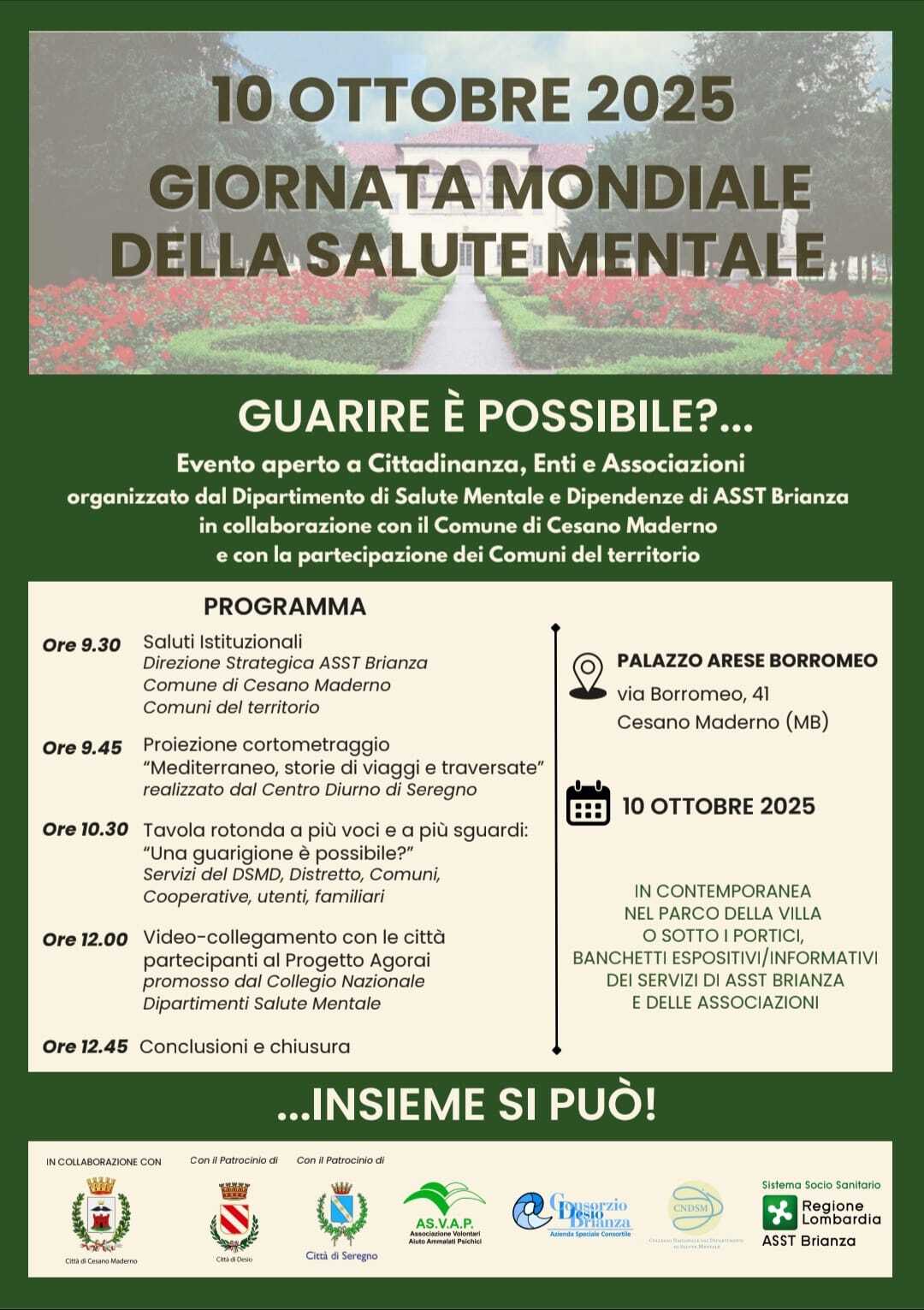 L'iniziativa, che si terrà a Palazzo Arese Borromeo (via Borromeo, 41), dalle 9.30 alle 13.15, è organizzata dalla Psichiatria Ovest del Dipartimento Salute Mentale e Dipendenze di ASST Brianza, in collaborazione con il Comune di Cesano Maderno e con il patrocinio dei Comuni di Desio e Seregno. Partecipano servizi di Salute Mentale e del Distretto di Desio, utenti, famigliari, associazioni, enti del Terzo Settore , Ufficio di Piano di Desio.