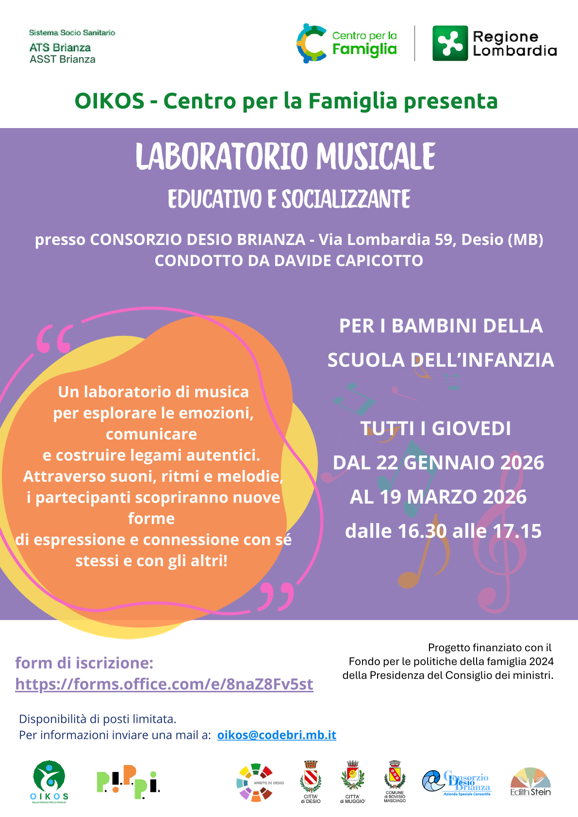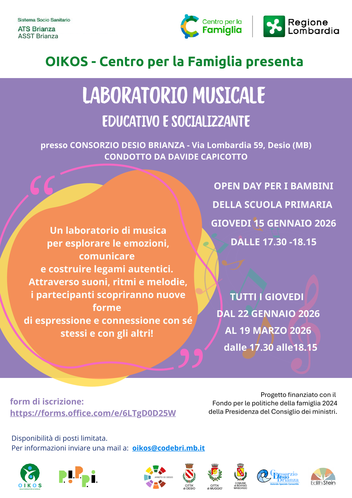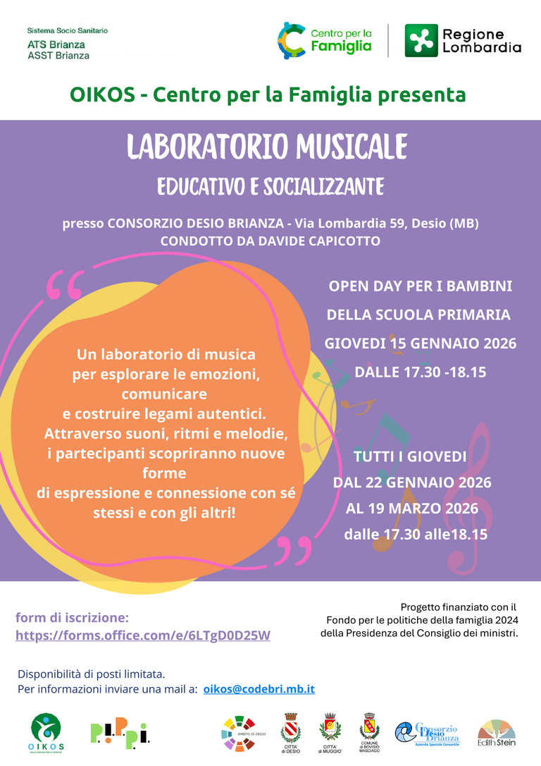 Llaboratori musicali educativi, promossi dal Centro Famiglia Oikos Consorzio Desio Brianza, condotti da Davide Capicotto, pensati come spazi di espressione, relazione e sviluppo delle competenze emotive e sociali dei minori.